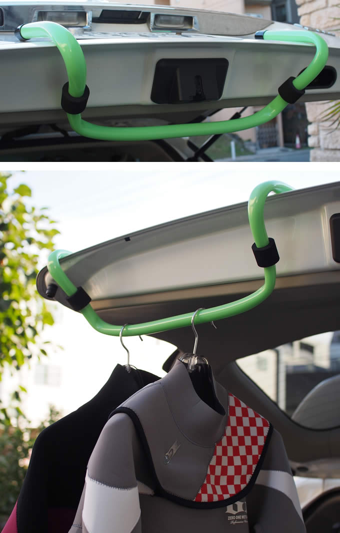 超便利で再入荷! バックドアハンガー キャリラッくんは便利なバックドアハンガー。車のハッチドアに掛けるだけで、ウエットスーツやお着替えポンチョを干すことができます。また、持ちにくい幅広のボードをもったり、地面においてワックススタンドとしても使用できます。 ¥2980(税別)のところを |