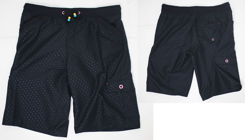 ショーニーのボードパンツ。柄の水玉は光の加減で見えるほどで目立たなく隠れたおしゃれ感です。腰の部分はゴムなのでストレッチします。またひもで締め付けサイズの調整ができます。 |